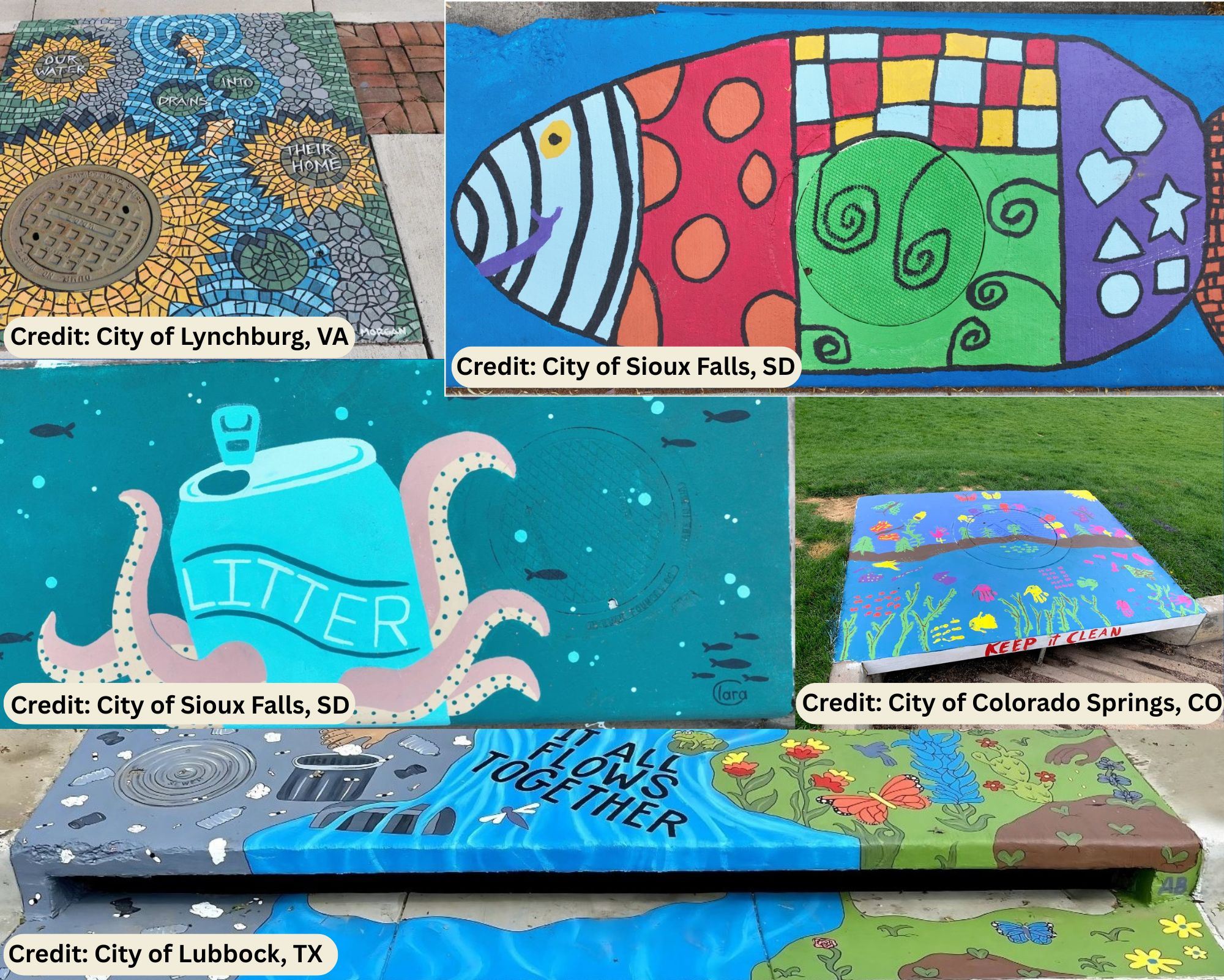 Looking for inspiration? Check out the storm drain art contests in these cities: Lynchburg, VA, Colorado Springs, CO, Sioux Falls, SD, Lubbock, TX